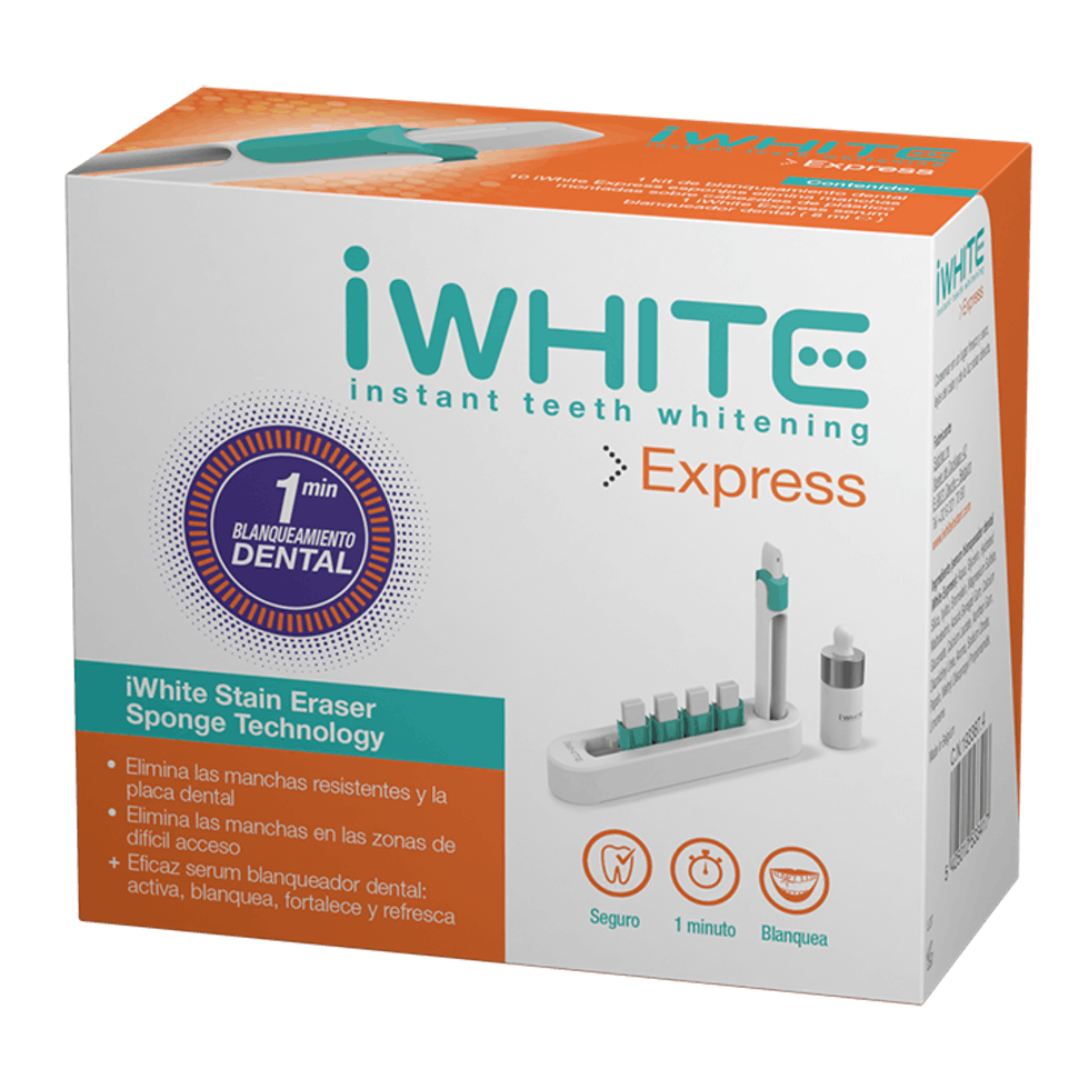 Este kit de blanqueamiento dental instantáneo, iWhite Express, elimina las manchas persistentes y la placa en las superficies dentales de difícil acceso, proporcionando resultados visibles en solo 1 minuto. iWhite Express es un kit innovador y seguro que ofrece resultados inmediatos. La estructura ultrafina de la esponja tiene una gran capacidad de absorción y elimina fácilmente las manchas persistentes y la placa en las superficies dentales de difícil acceso. La esponja debe activarse con unas gotas del serum de blanqueamiento dental iWhite Express, que contiene enzimas blanqueadoras naturales, activos que refuerzan el esmalte y agentes refrescantes para conseguir una sensación de aliento fresco. La combinación de la esponja y del serum dará a tus dientes un color blanco nacarado y permitirá que la superficie dental esté limpia durante mucho tiempo.