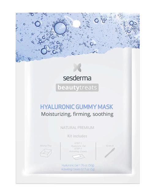 La mascarilla facial hidratante Hyaluronic Gummy Mask, rica en ácido hialurónico y colágeno hidrolizado, hidrata y rellena, mejorando el aspecto de las arrugas y líneas de expresión, dejando la piel con un aspecto rejuvenecido. Mezcla para obtener la máscara de gelatina que se adhiere al rostro y, tras dejarla actuar, se solidifica y se retira fácilmente como una máscara de goma.